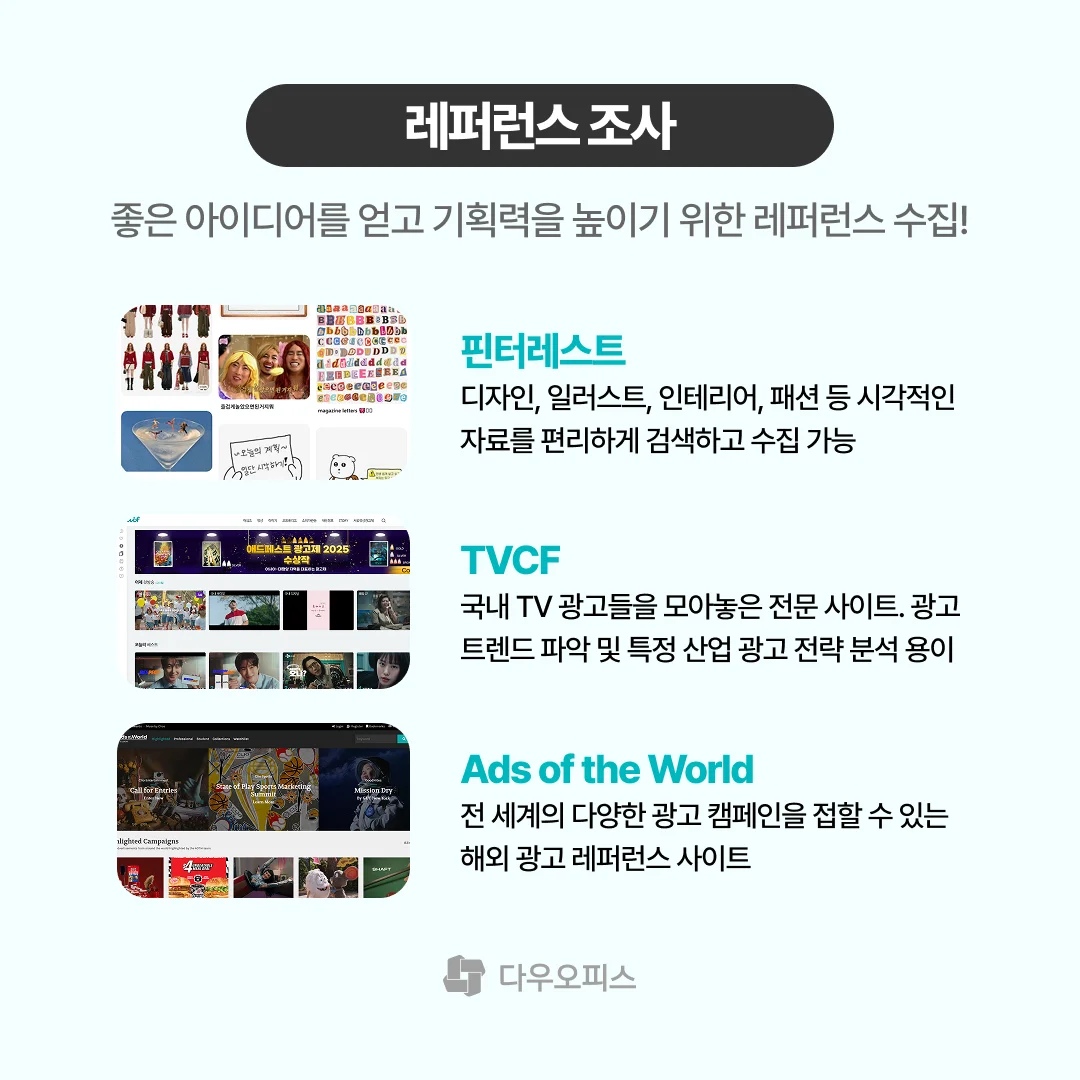 좋은 아이디어를 얻고, 기획력을 높이기 위해서는 다양한 분야의 레퍼런스를 살펴보는 것이 매우 중요한데요. 디자인, 광고 등 시각적인 자료부터 경쟁사의 활동까지 참고할 수 있는 사이트를 추천해 드릴게요! 이걸 활용하면 일잘러처럼 빠르게 방향을 잡을 수 있어요.