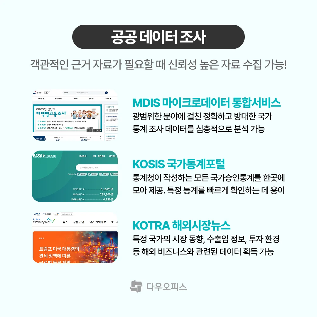 업무를 진행하면서 객관적이고 신뢰할 수 있는 근거 자료가 필요한 순간을 경험해 보셨을 거예요. 그럴 때는 개인적인 의견이나 불분명한 출처의 정보보다는, 누구나 납득할 수 있는 신뢰성 있는 데이터를 활용해야 하죠!