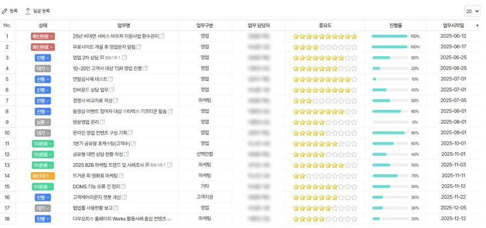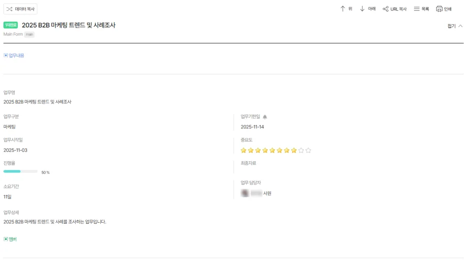 이 정보들이 업무 안에 자연스럽게 남아 있어 새로운 담당자도 업무 흐름을 빠르게 파악할 수 있습니다.